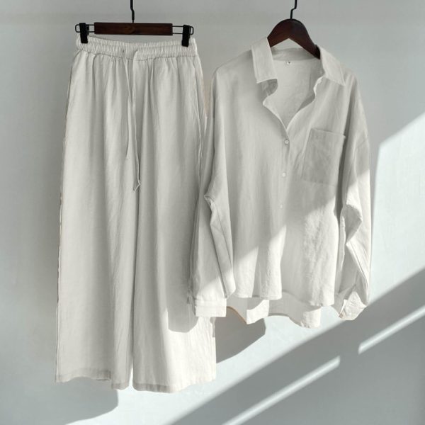 Airport Outfits for Women 2025 Summer 2 Piece Cotton Linen Sets Long Sleeve Buttons Shirts Wide Leg Pants Suits