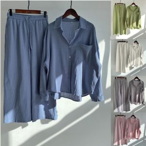 Women 2 Piece Suits Linen Sets Long Sleeve Button Shirts Wide Leg Pants Outfits