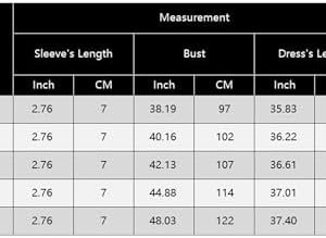 SMALL Bust: 38.19 / Dress’s Length: 35.83 / Sleeve’s Length: 2.76 MEDIUM Bust: 40.16 / Dress’s Length: 36.22 / Sleeve’s Length: 2.76 LARGE Bust: 42.13 / Dress’s Length: 36.61 / Sleeve’s Length: 2.76 X-LARGE Bust: 44.88 / Dress’s Length: 37.01 / Sleeve’s Length: 2.76 XX-LARGE Bust: 48.03 / Dress’s Length: 37.4 / Sleeve’s Length: 2.76