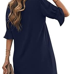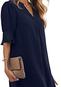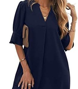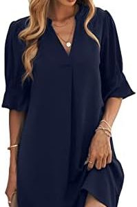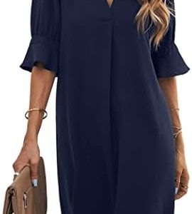 Famulily Womens Dresses V Neck Puff Sleeve Solid Loose Fit Casual Summer Beach Flowy Shirt Dress