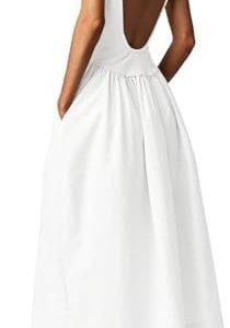 Fisoew Womens Spaghetti Strap Dress V Neck Backless Summer Casual A Line Cami Dress with Pocket