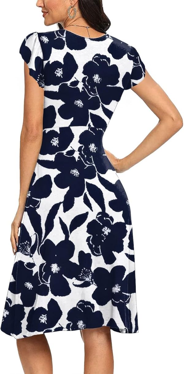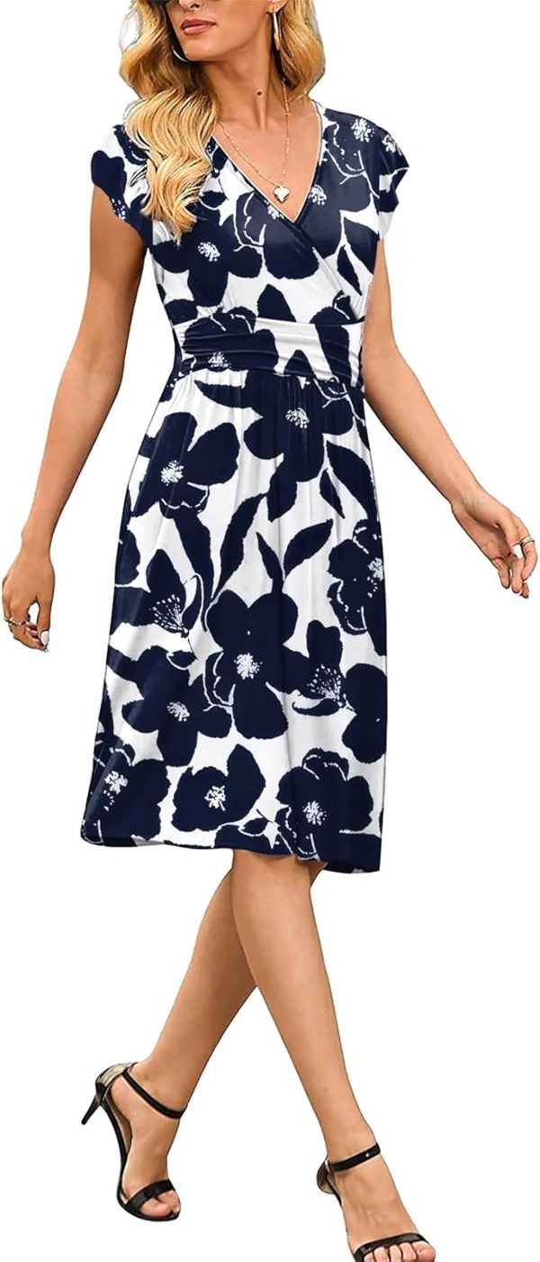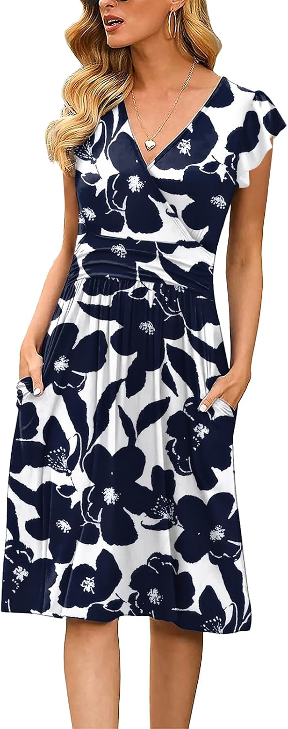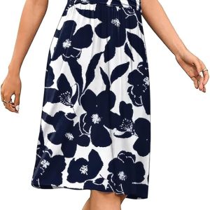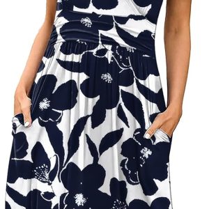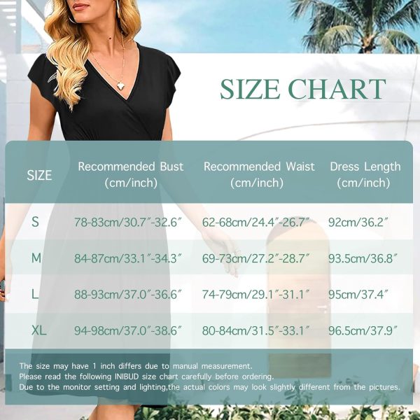 INIBUD Women Summer Dress Casual V Neck Short Sleeve Adjustable Drawstring Waist with Pockets Sundress