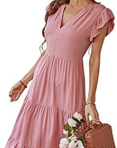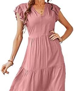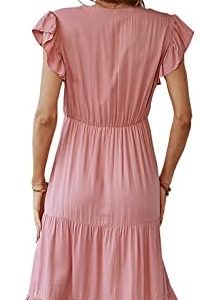 Les umes Women’s Midi Dresses V Neck Short Ruffle Sleeve Summer Dress Pleated Waist Split Dresses for Women