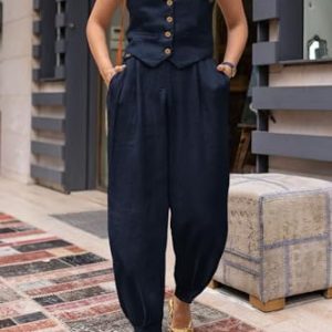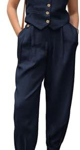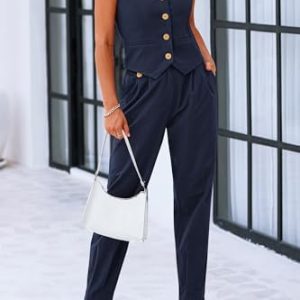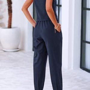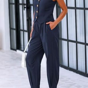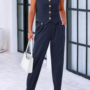 PRETTYGARDEN Women’s Summer Two Piece Outfits V Neck Button Front Cropped Tank Tops Vest Pockets Pants Cotton Matching Sets