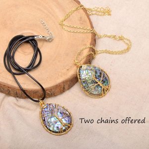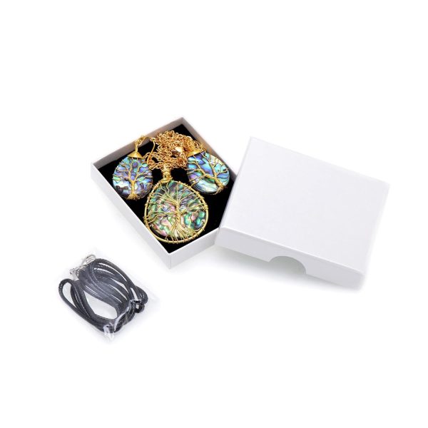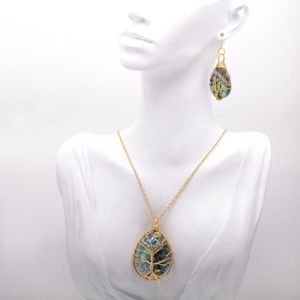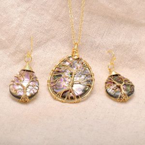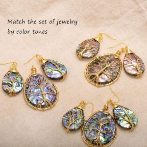 This is a handmade jewelry set, including a pair of sea abalone shell earrings and a pendant necklace, hand wiring tree of life pattern wrapped on the shell