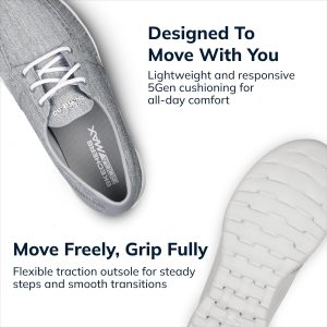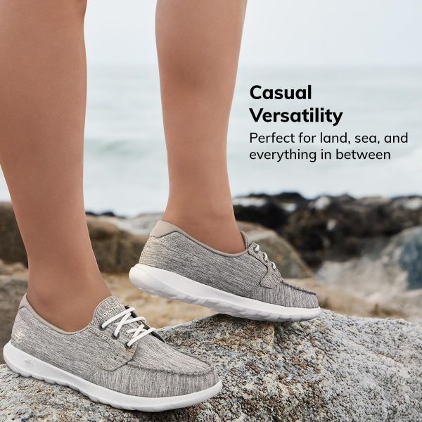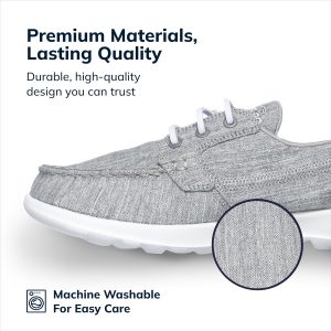 Heathered linen moc toe boat shoe with EZ fit closure.