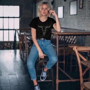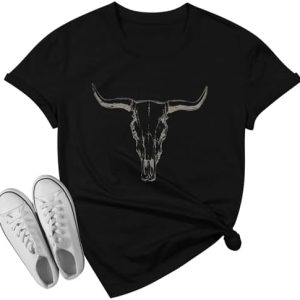 VILOVE Cowgirl Shirts for Women Boho Cow Skull Shirt Vintage Western Rodeo Graphic Tee Short Sleeve Bull Skull Top