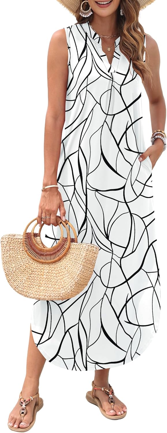 WNEEDU Women Summer Dress Maxi Casual Loose Beach Sundresses V Neck Sleeveless Dresses with Pockets