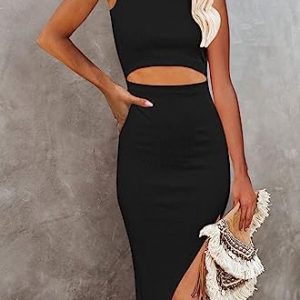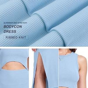 WNEEDU Womens Summer Bodycon Dresses Crew Neck Cutout Midi Dress Casual Slit Sleeveless Ribbed Knit Dress