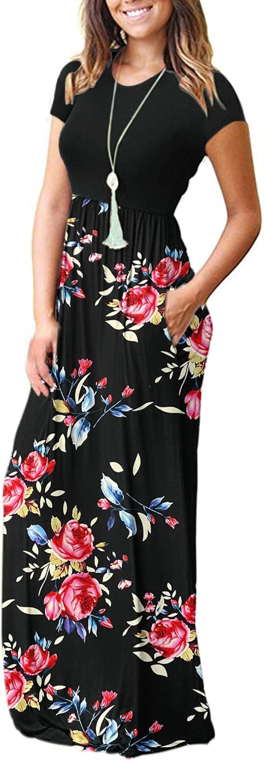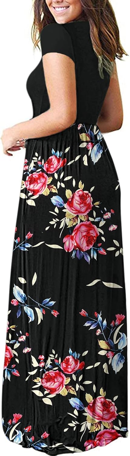 WNEEDU Women’s Summer Dress Short Sleeve Casual Long Dress Loose Maxi Dresses with Pockets