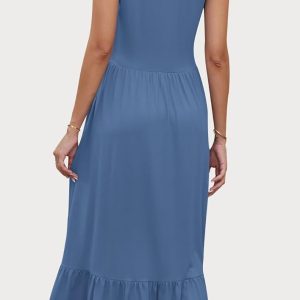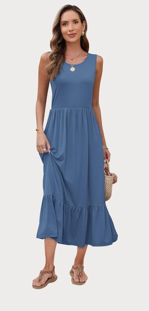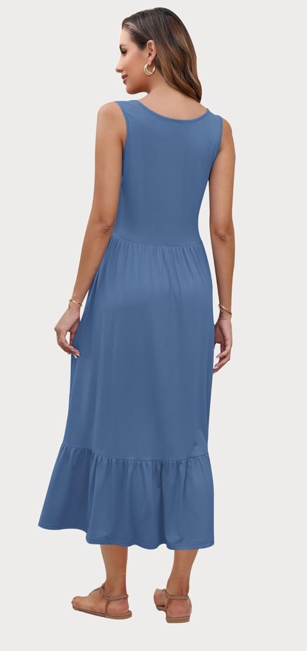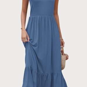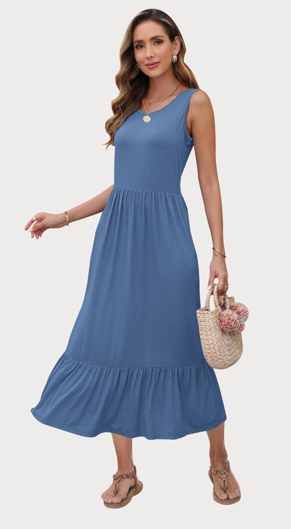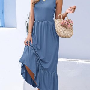 WNEEDU Womens Summer Dresses 2025 Sleeveless Maxi Dress Crewneck Casual Flowy Tiered Swing Dress with Pockets