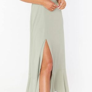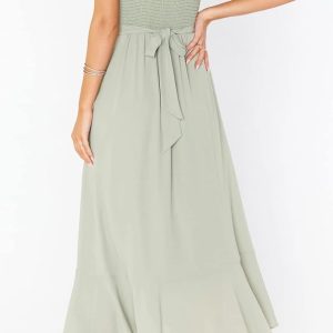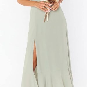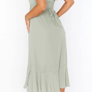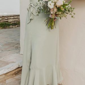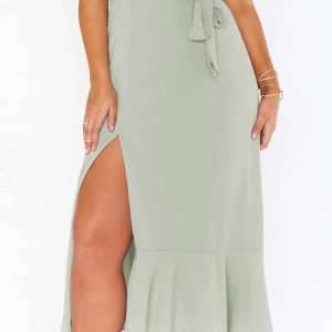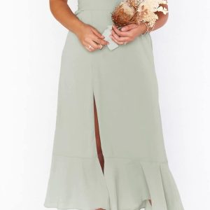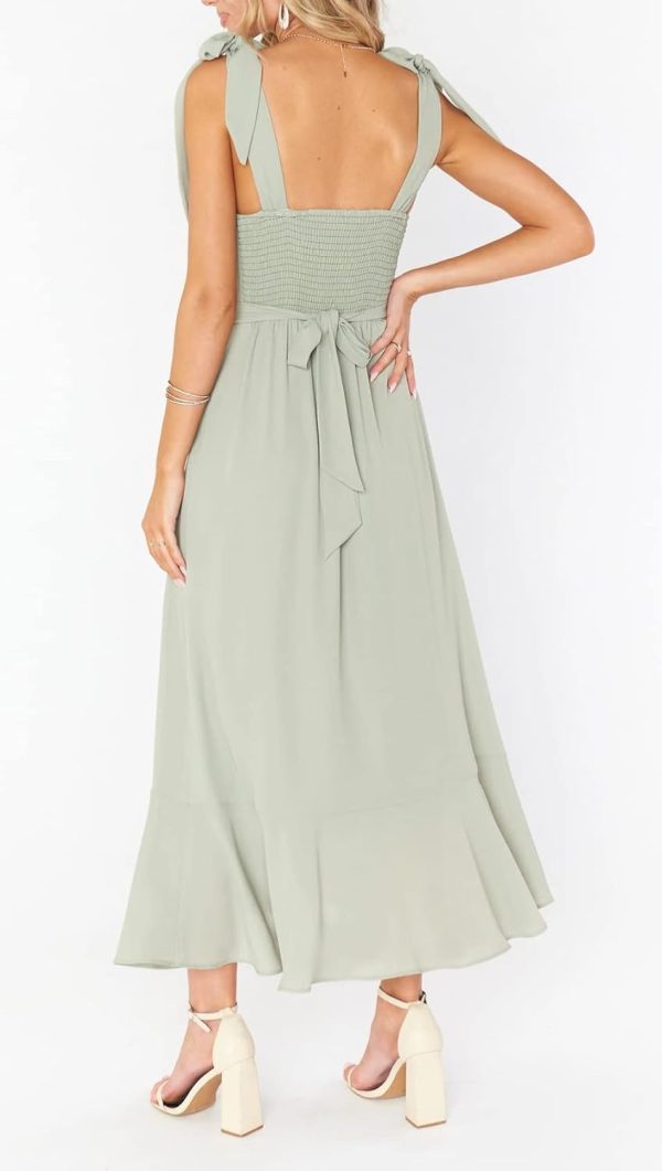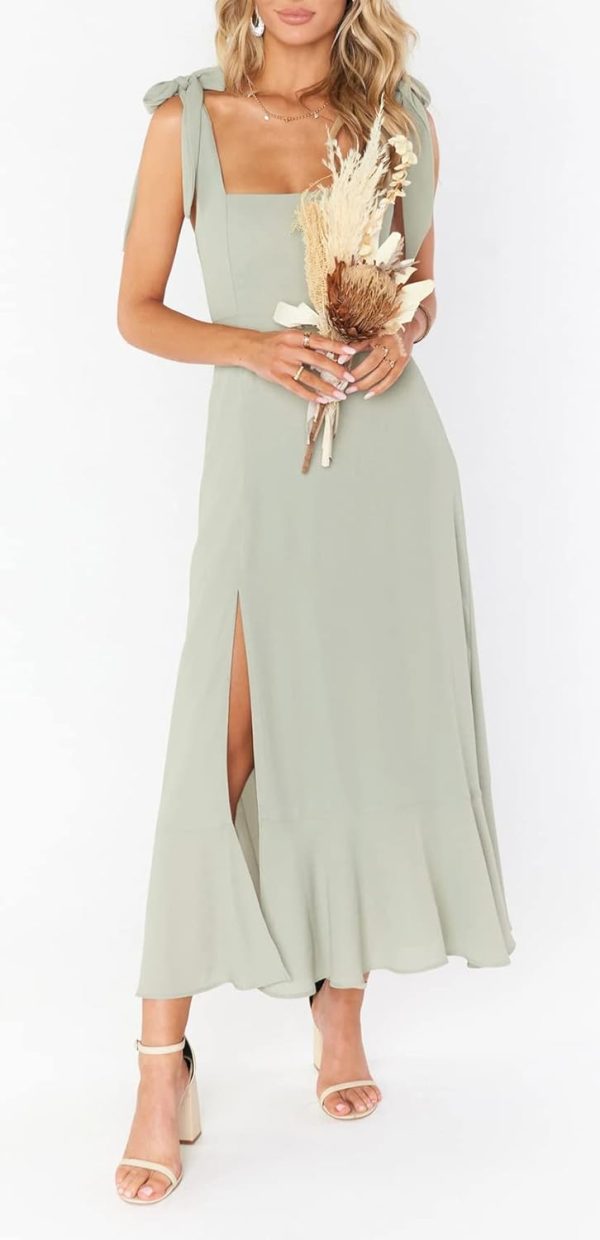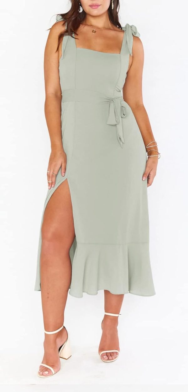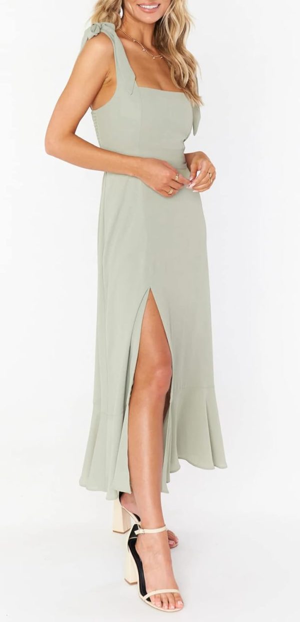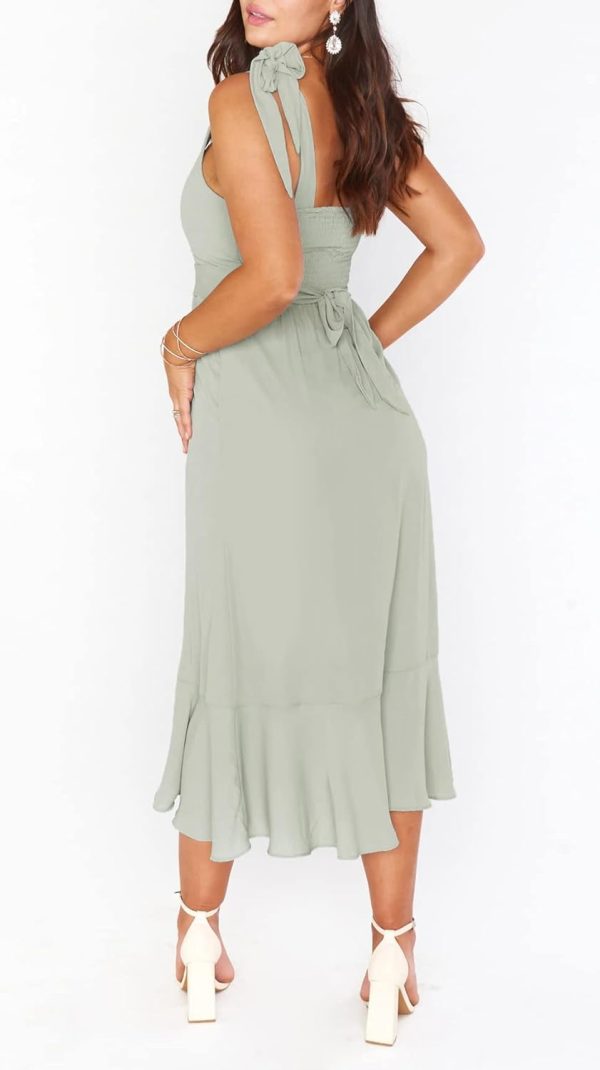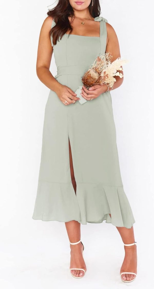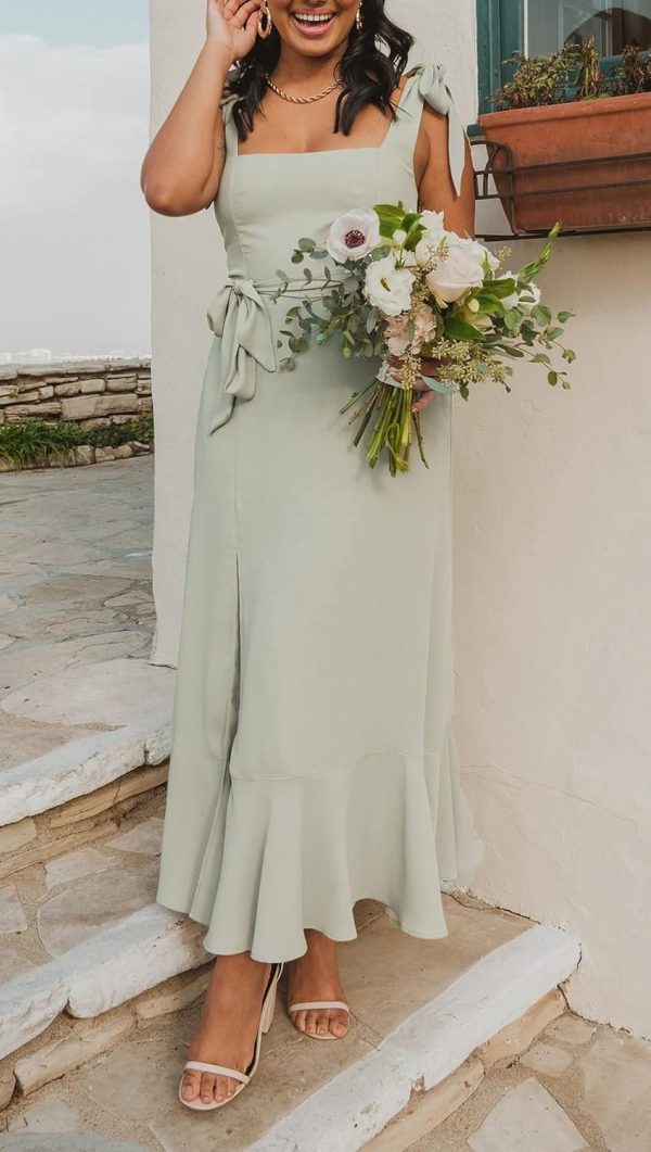 Women Bridesmaid Dresses Square Neck Ruffle Split Midi Dress Adjustable Wide Tie Straps Sundress with Belt for Wedding Guest